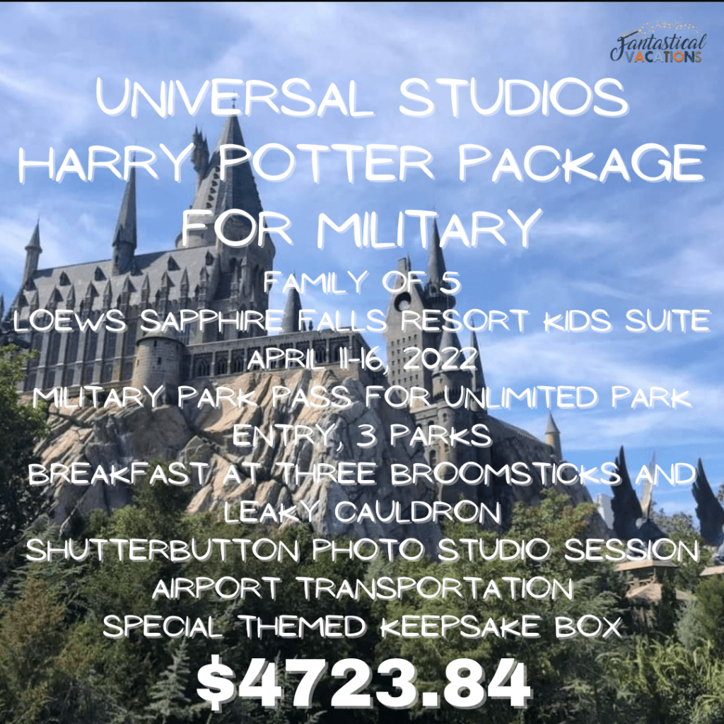 Universal is a HUGE savings and a really great deal! Similar to in the past, they can get a discount on a package, including the Harry Potter Package they currently offer, at a special military pricing. With all packages, or available for individual purchase, they get either a 2 park or 3 park pass that allows them to have unlimited park to park visits for the entire year of 2022, similar to a season pass. Here are a few examples of the great pricing for Universal: