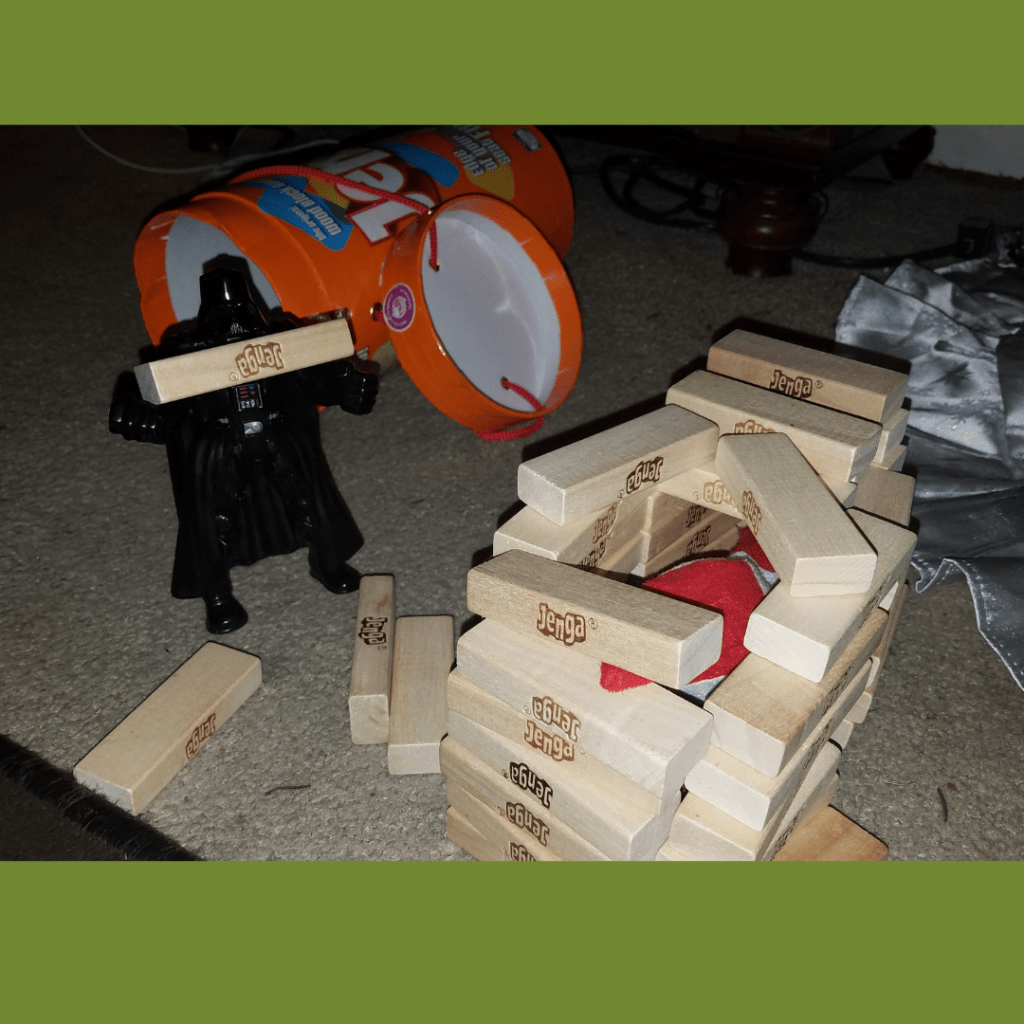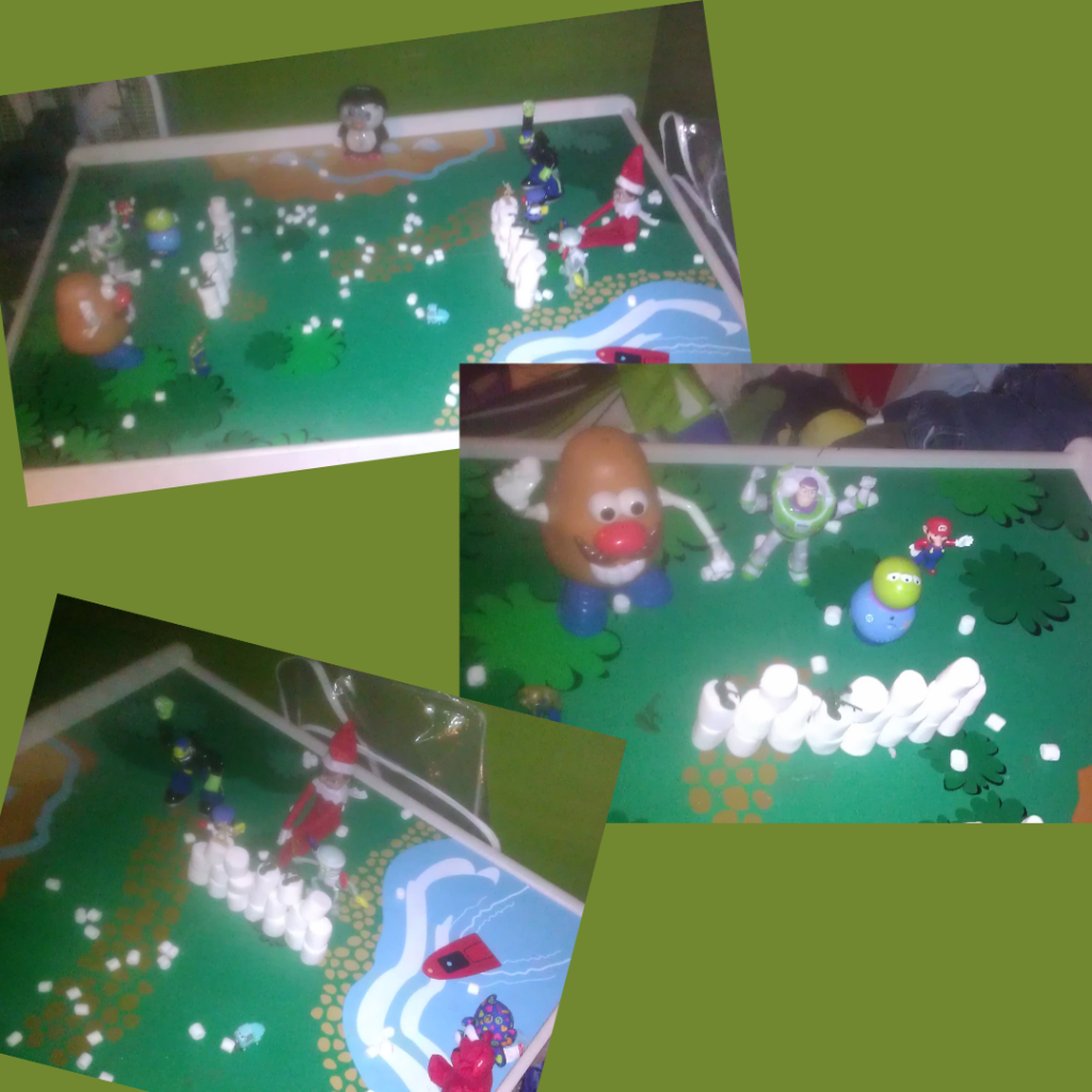 Snowball fight!!!! Or….mini marshmallow fight with all the action figures and other toys around the house. I’m not sure who’s winning.
