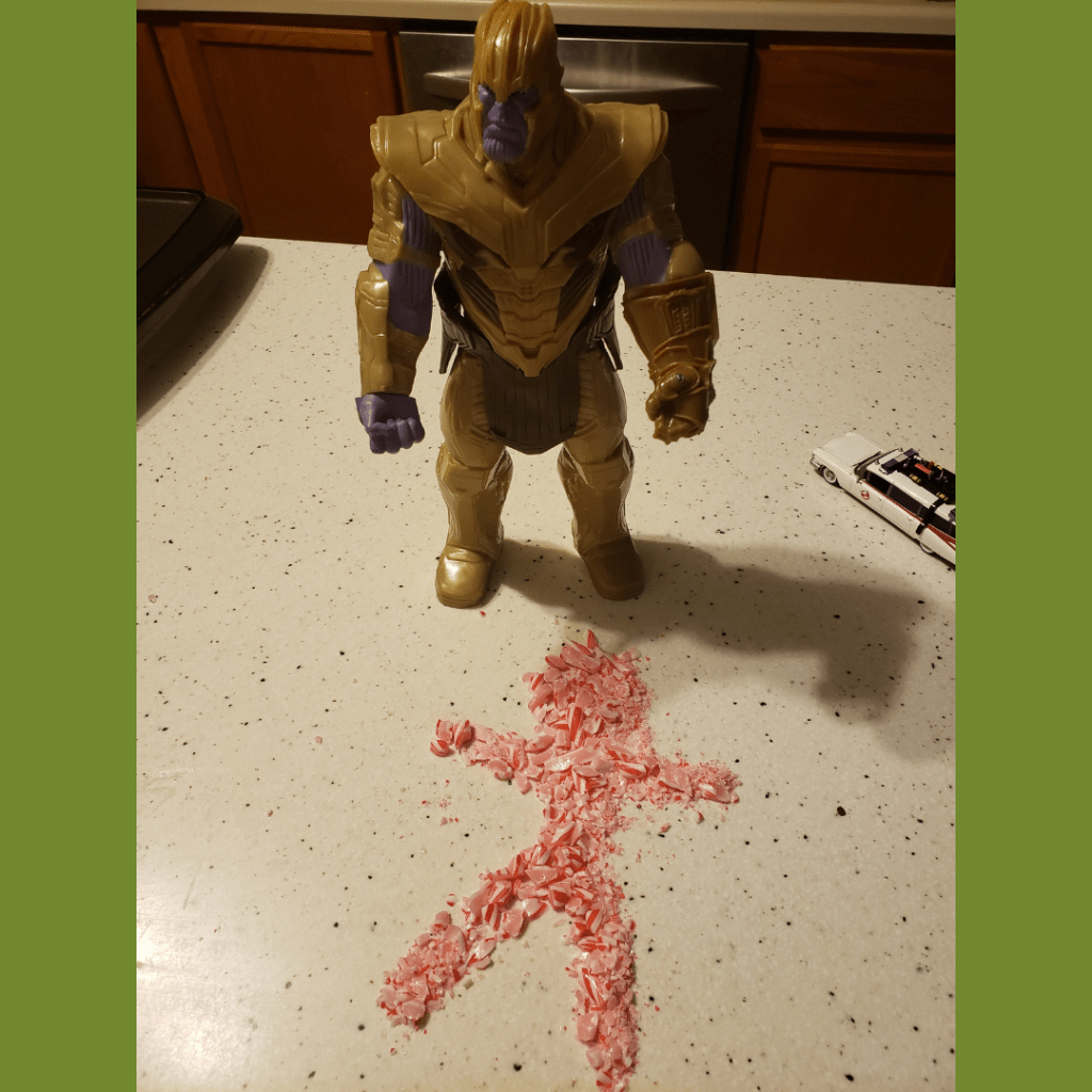 I saved my favorite two for last….First, he got turned to peppermint dust by Thanos.
