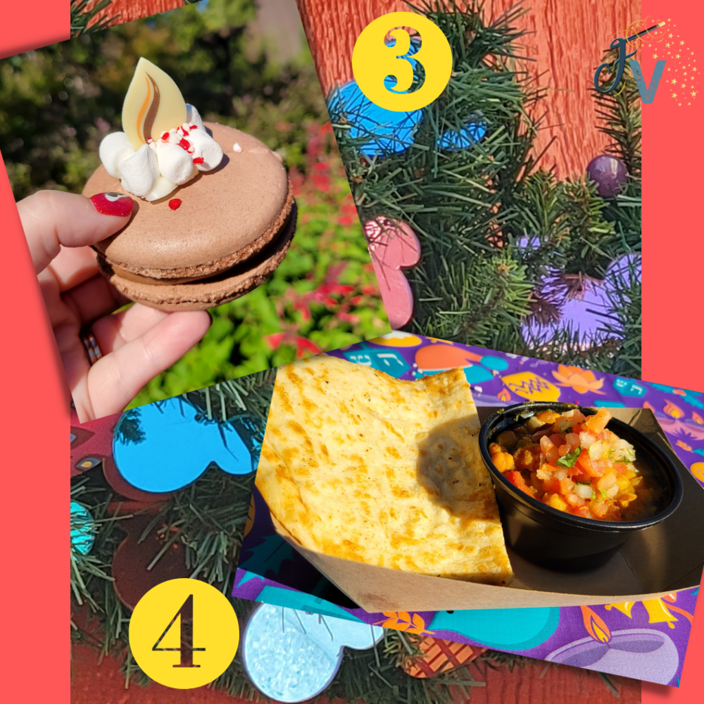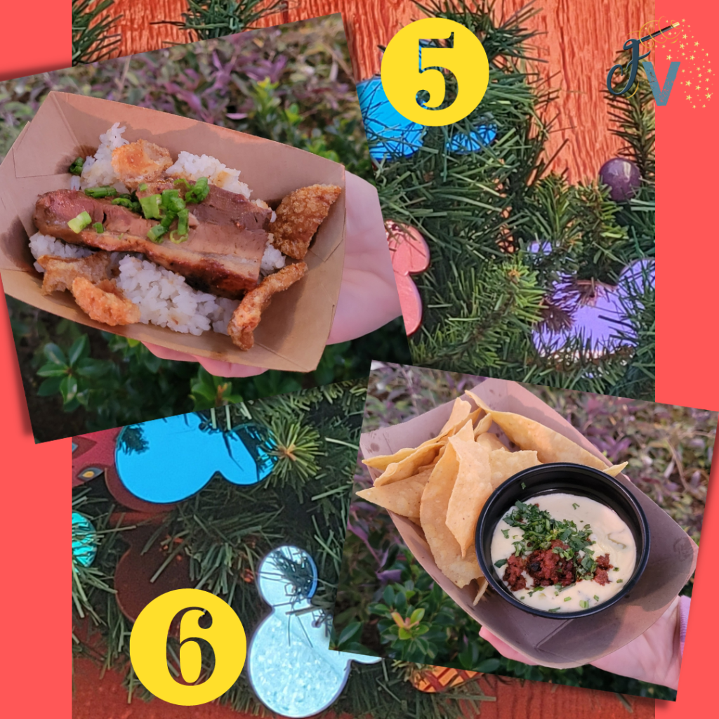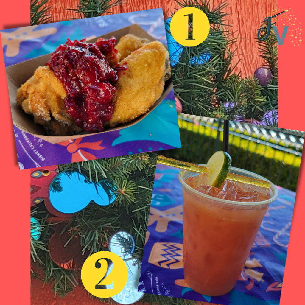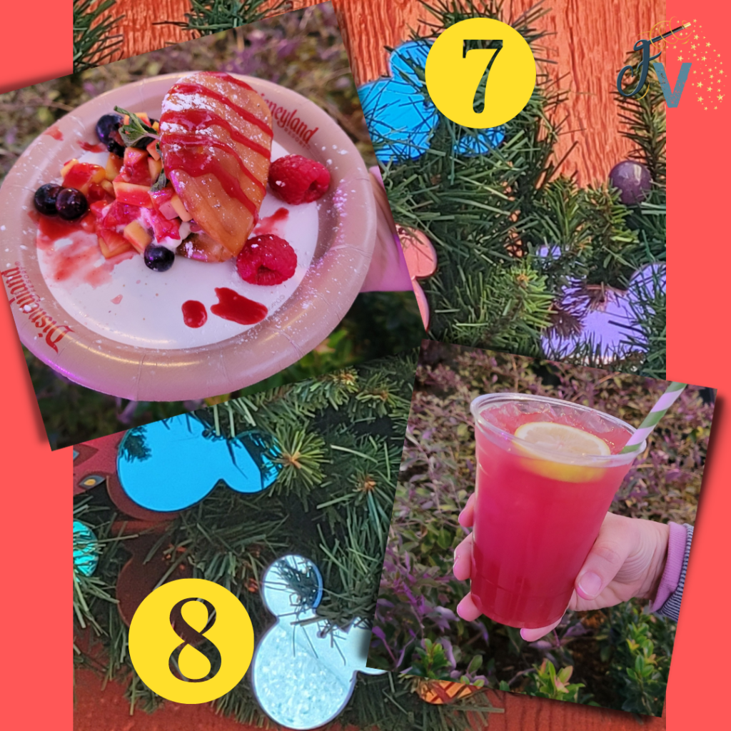 Next up was time for some more food! The Festival of Holidays was happening, and there were so many snacks and drinks to be had! Disneyland usually does what they call the Sip and Savor Pass for their festivals. This is always a great deal! For their current offering, we got a pass good for 8 snacks and/or drinks (non alcoholic) for the price of $56. Most snacks are $7-8, so it saves you some money. I don’t recommend using for dessert type items, because they are closer to $5-6 and you may not get your money’s worth that way. The other nice thing about the pass is you don’t have to use them all in one day. It is good the whole festival season, so you can save some of your credits for another day if you’d like.