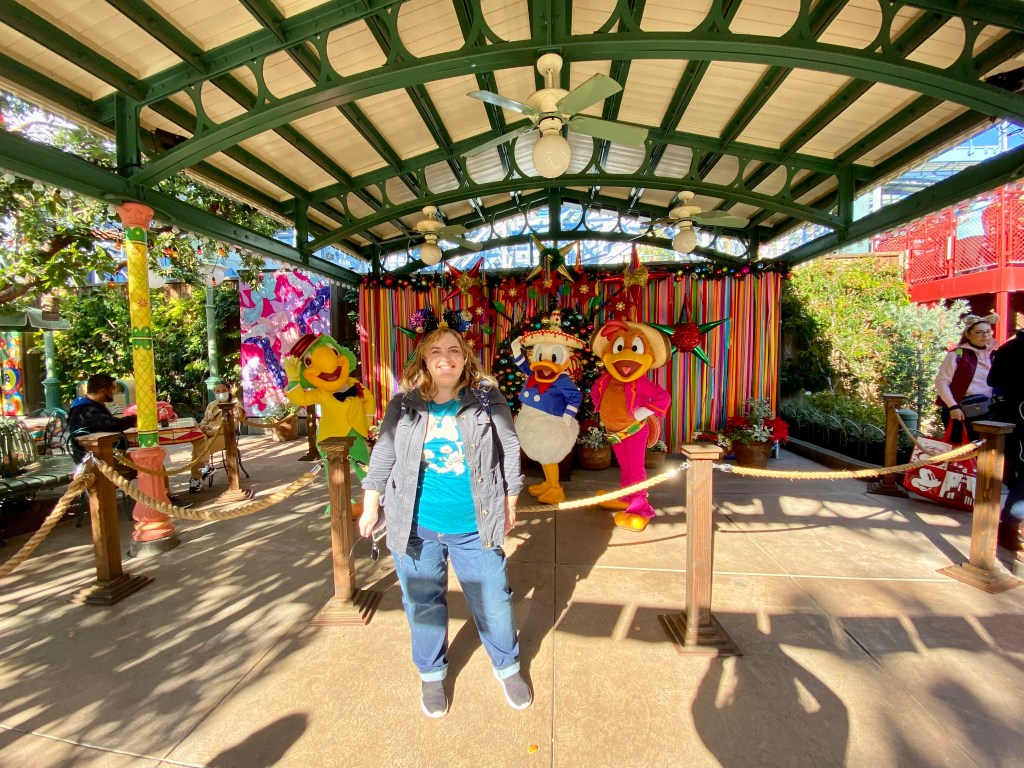 We moved along from Paradise Pier, got some Joffrey’s coffee, and rode The Little Mermaid. Although most rides have variances from Disneyland to Disney World, this one was exactly the same. But it’s always been one I love. After the ride, we explored along the Paradise Gardens Park area. Just our luck, the 3 Caballeros were out greeting guests! They are so silly!