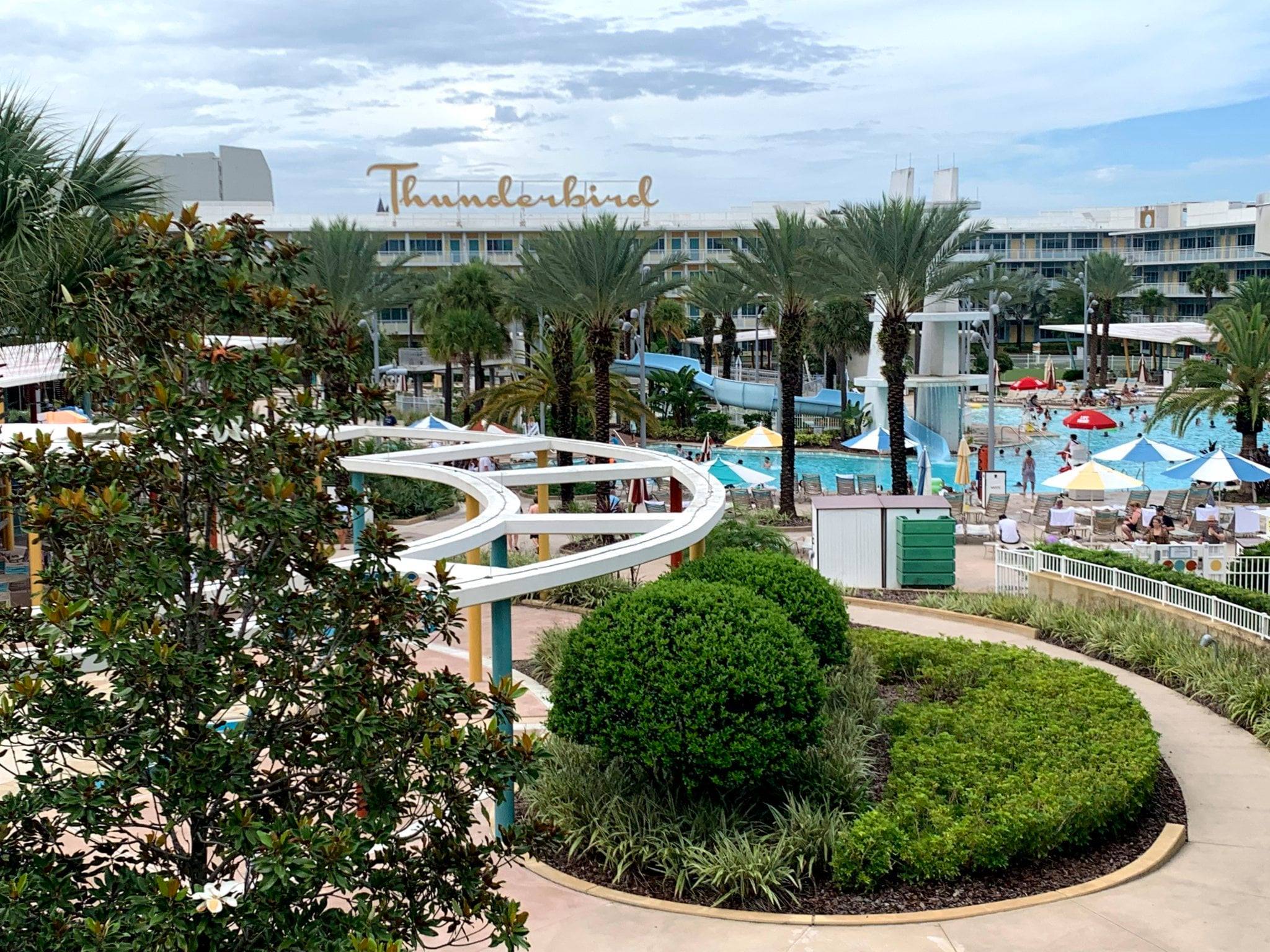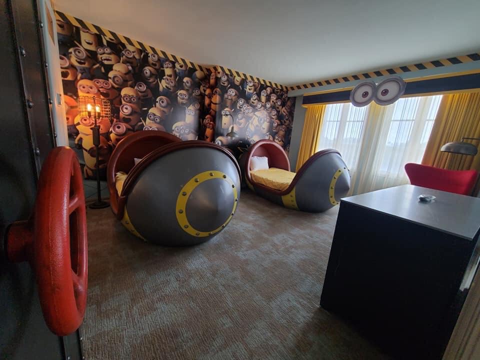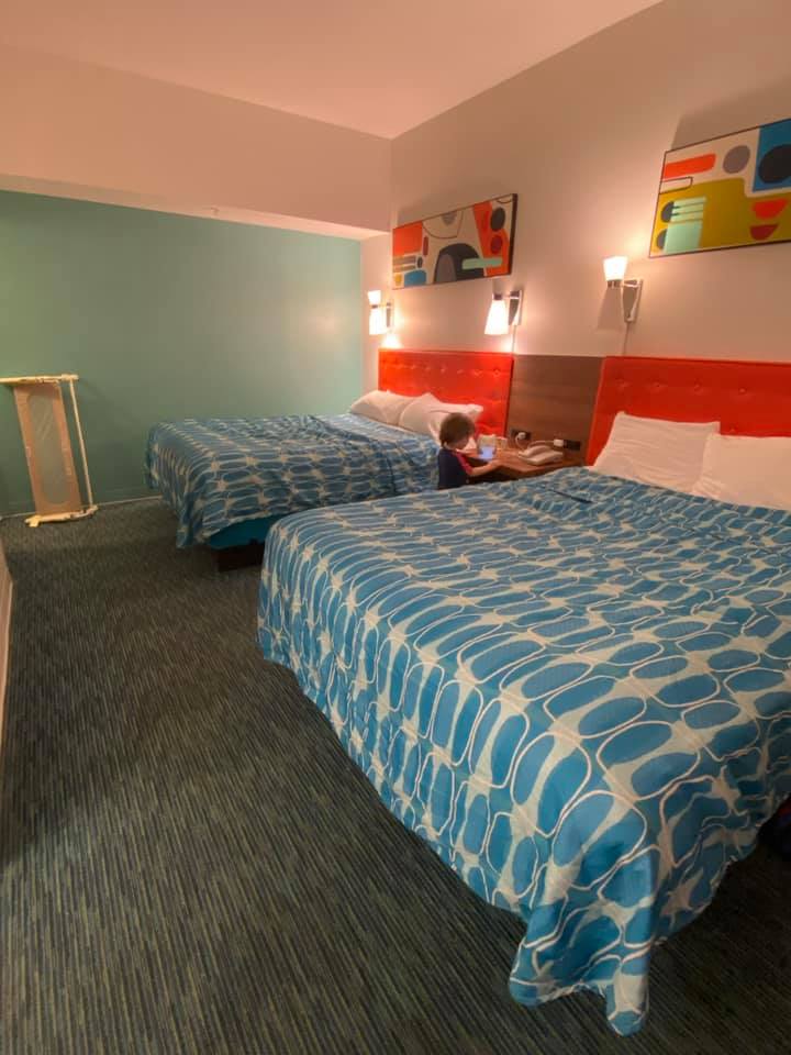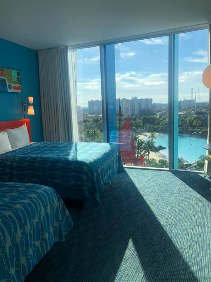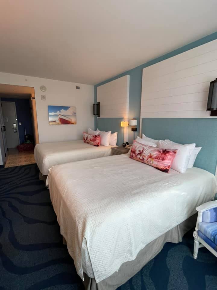 This resort is a retro throwback to the 1950s and 60s. It features standard rooms (some of which have amazing views overlooking Volcano Bay), and Family Suites, which sleep up to 6 guests and have a small kitchenette, microwave, and living space. You will be fully immersed in the era from the music, decor, and even the toiletries offered in the rooms.