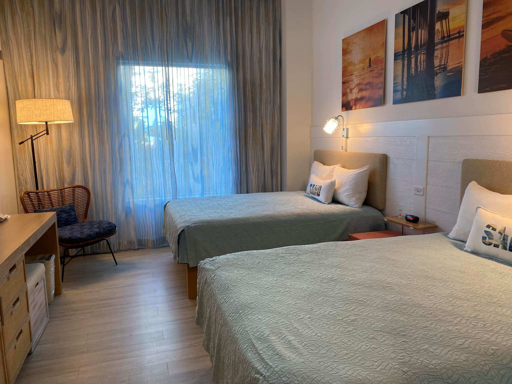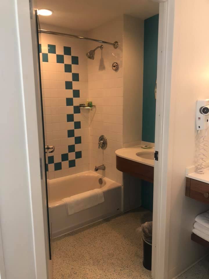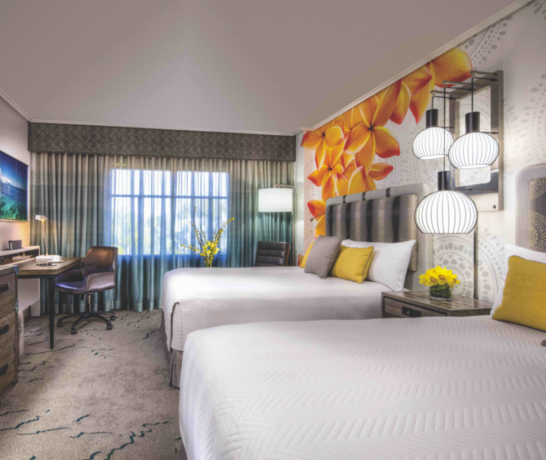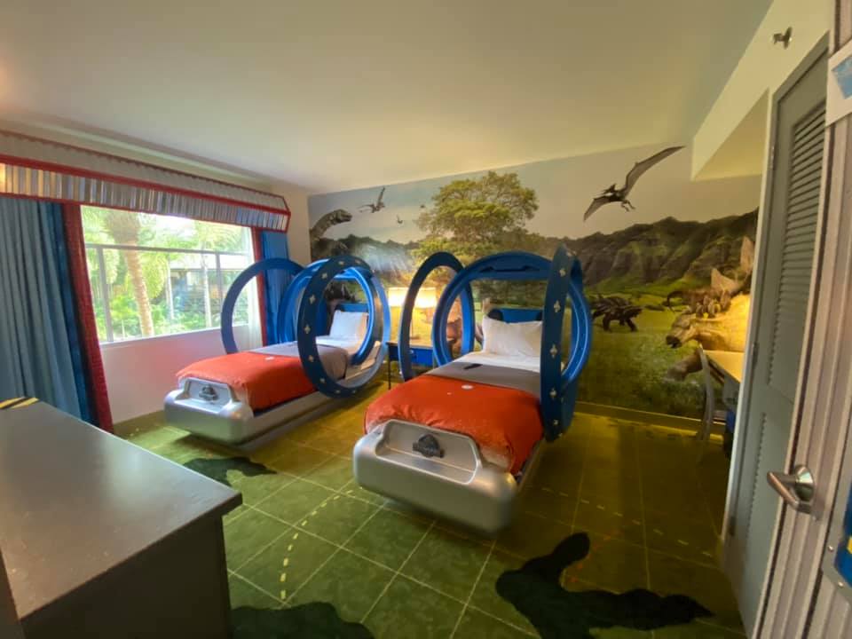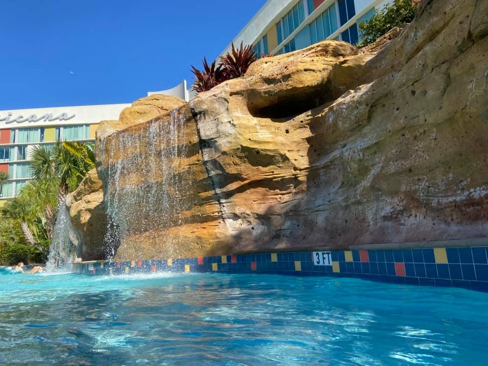This resort is a retro throwback to the 1950s and 60s. It features standard rooms (some of which have amazing views overlooking Volcano Bay), and Family Suites, which sleep up to 6 guests and have a small kitchenette, microwave, and living space. You will be fully immersed in the era from the music, decor, and even the toiletries offered in the rooms.