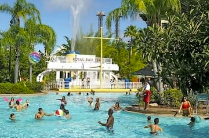 white sand beach on a huge lagoon-style pool. The palm tree-lined pool area features two hot tubs and the Royal Bali Sea interactive water play area for children