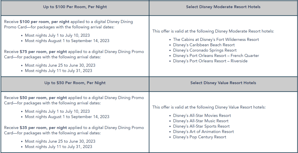 View the chart below to explore eligible Disney Resort hotels, Disney Dining Promo Card values and arrival dates.