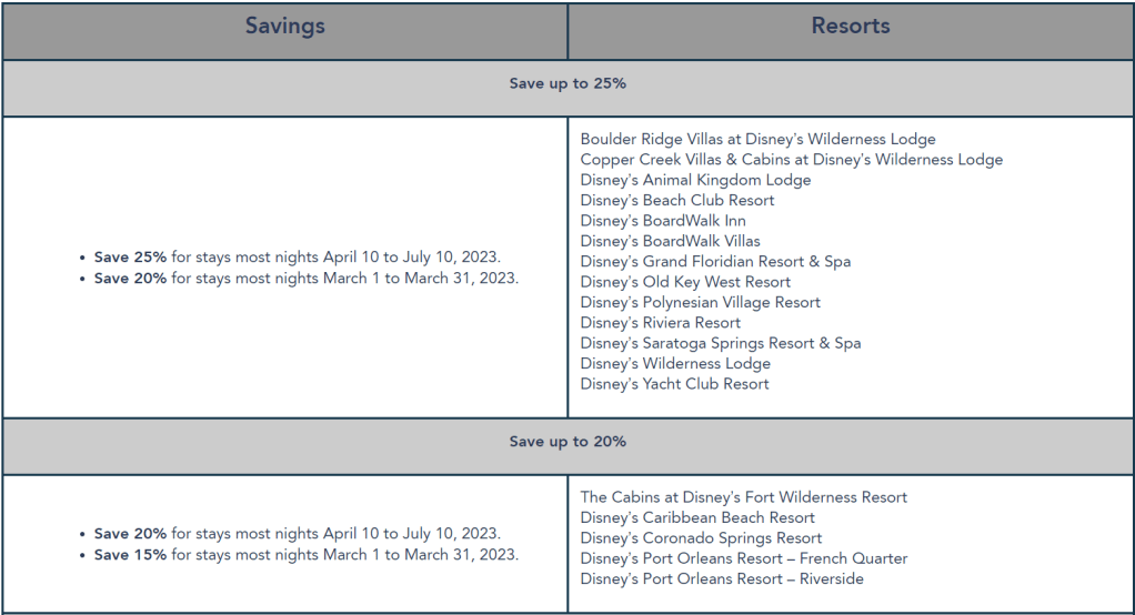 This offer is valid for the Disney Resort hotels listed below. View the chart to explore savings.