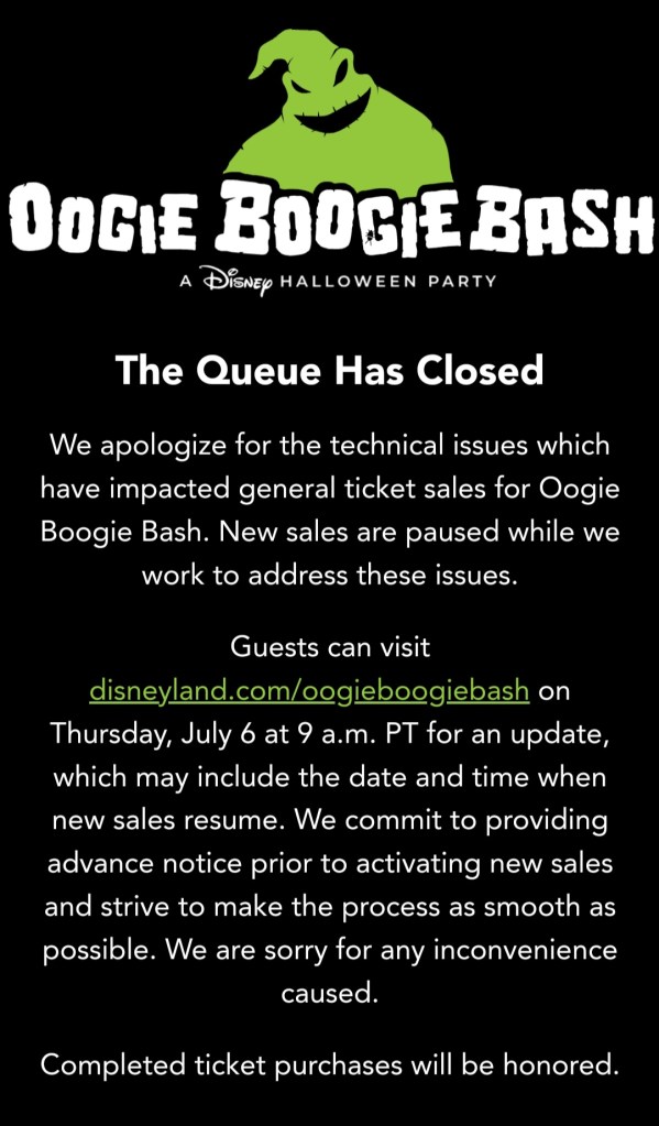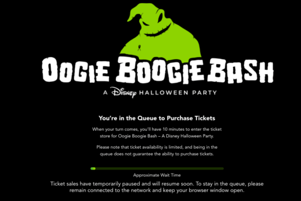 Oogie Boogie Bash tickets are officially on sale! We hopped in the queue to get the tickets I needed. I was trying to get them for Halloween night. As if the stress of that isn’t enough. I waited. I looked. Ok, other agents are having trouble. After about 20 minutes, my screen updated. I’m in! Oh….no I’m not! Instead, Oogie Boogie informed me that ticket sales had been paused.