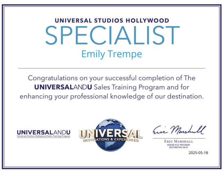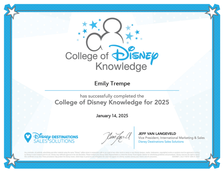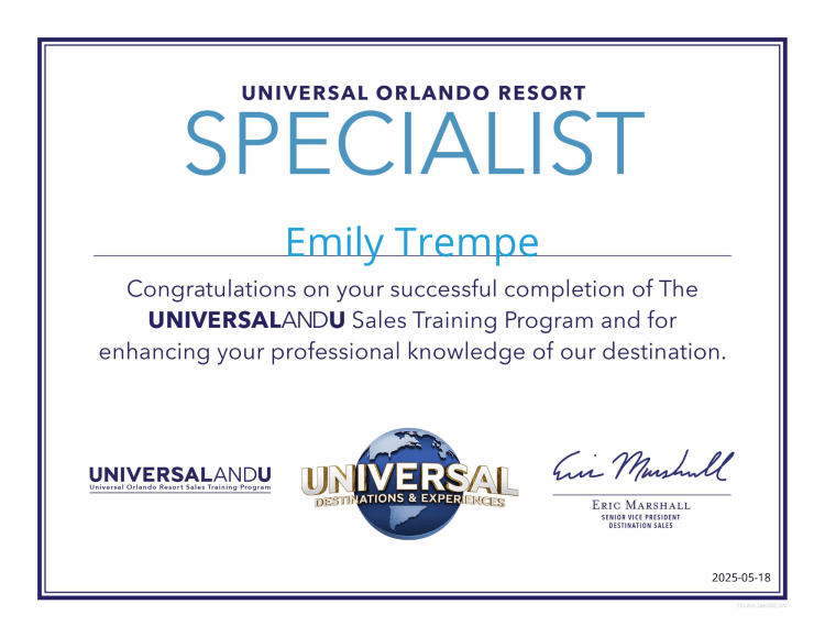 I specialize in Disney, Universal, cruises and all inclusive resorts, but am educated and able to book almost any type of vacation you’re looking for to any destination!