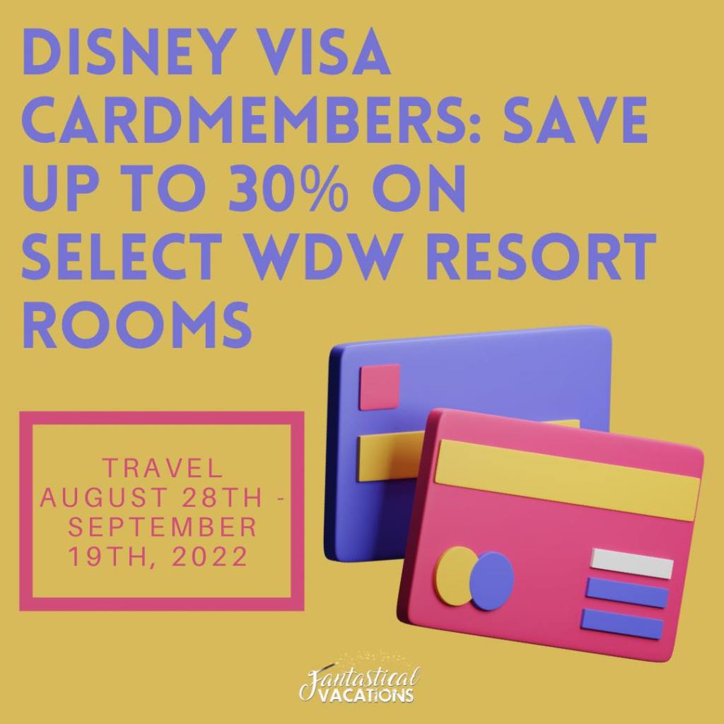 Disney Visa Cardmembers can enjoy special savings on stays for most nights at select Walt Disney World Resort hotels from August 28 through September 19, 2022.